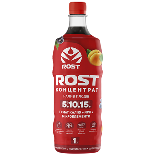 ROST® Концентрат – концентроване органо-мінеральне добриво на основі гумату калію, що містить комплекс макро- та мікроелементів. Добриво забезпечує рослини необхідними елементами живлення; мобілізує імунну систему рослин; покращує синтез цукрів, амінокислот, вітамінів в рослині; посилює поглинання води і кисню, що в результаті прискорює поділ клітин; інтенсифікує обмінні процеси; підвищує надходження поживних елементів в рослину; прискорює синтез нуклеїнових кислот і білка; активує білковий та вуглеводний обмін речовин; збільшує проникність клітинної мембрани; полегшує транспортування поживних речовин в середину клітини.